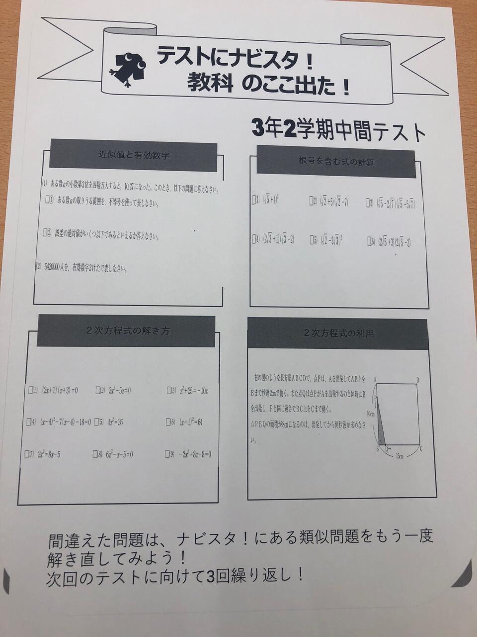 今回の範囲は主に平方根と2次方程式でした。