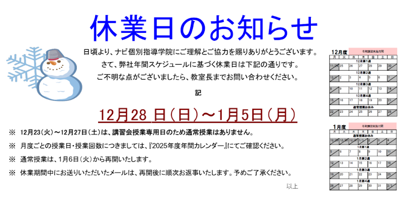 ※ 12月23日(火)~12月27日(土)は、講習会授業専用日のため通常授業はありません。