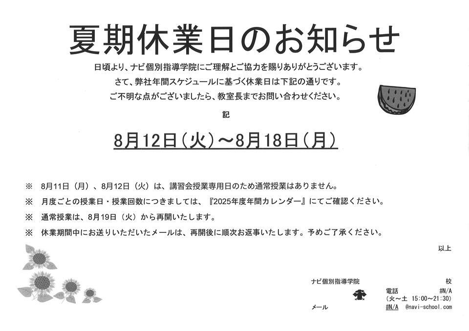 夏期休業日 8月12日(火)~8月18日(月)