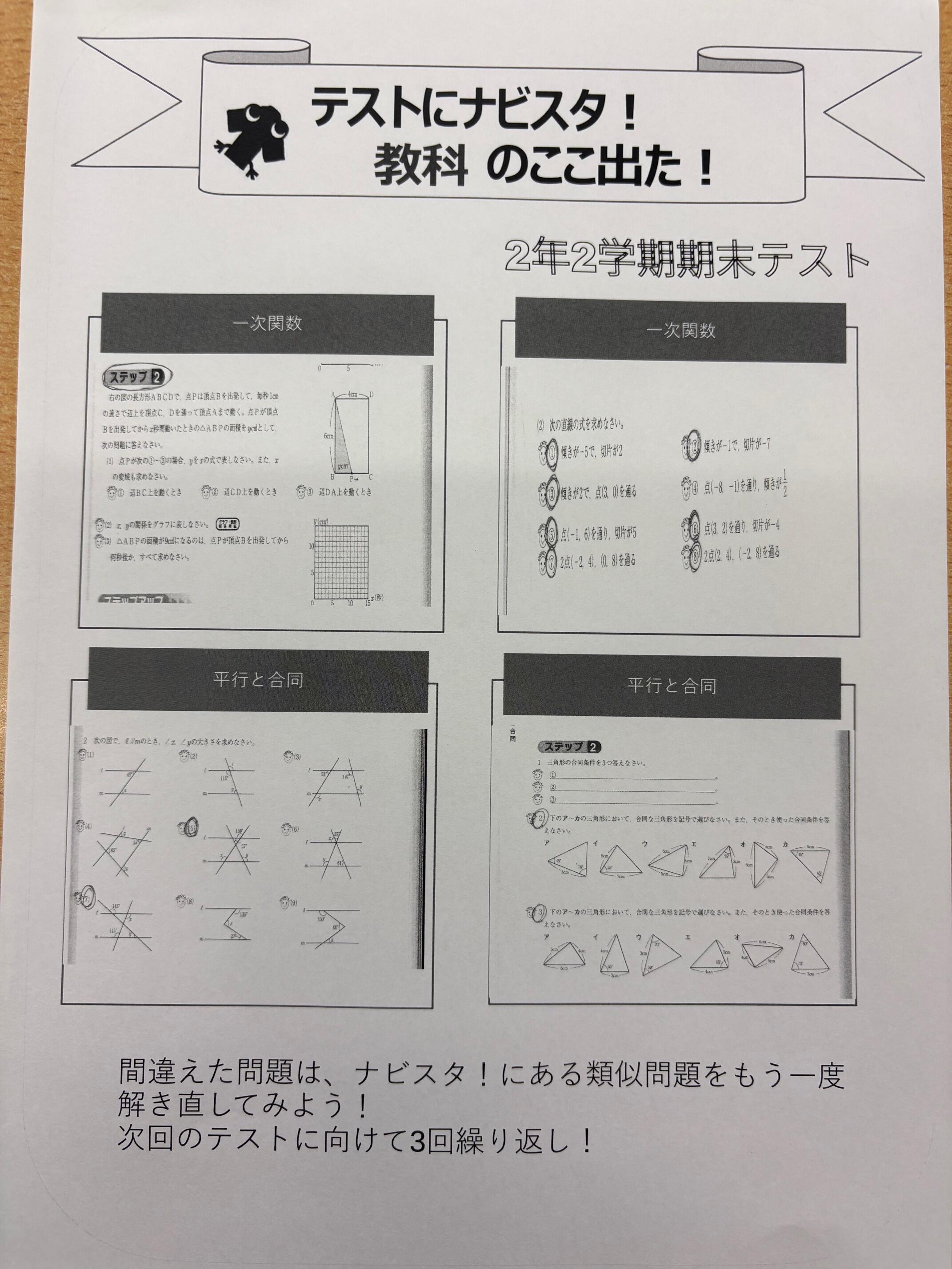 そこで、ナビ個別の自社教材「ナビスタ!」と近隣中学校の前回定期テストの分析を「ここ出た!」で確認してみましょう!