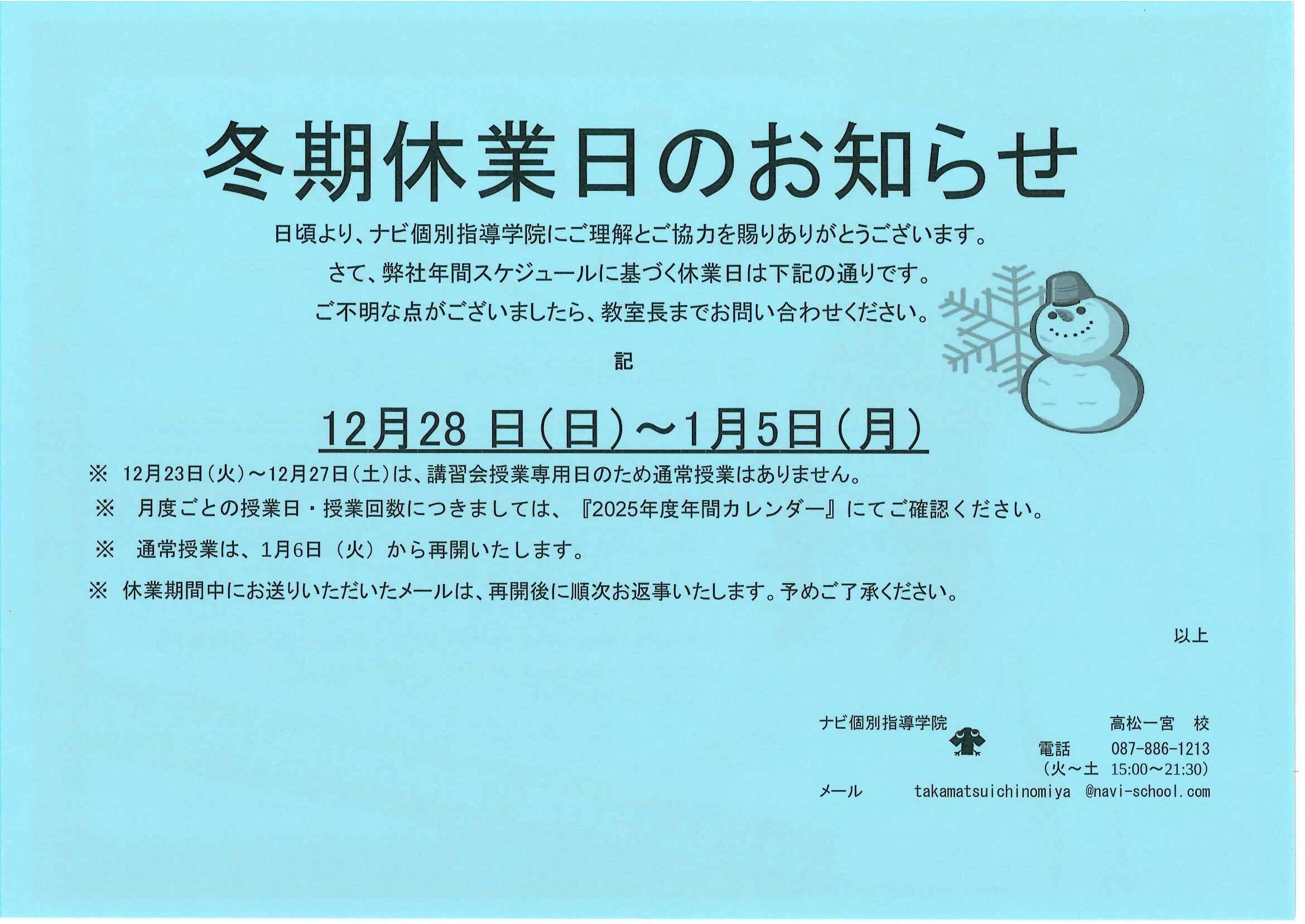 ※12月23日(火)~12月27日(土)は、講習会授業専用日のため通常授業はありません。