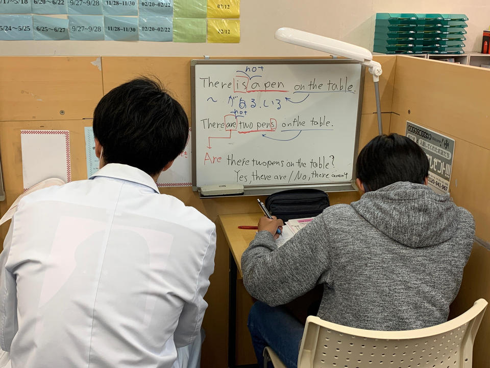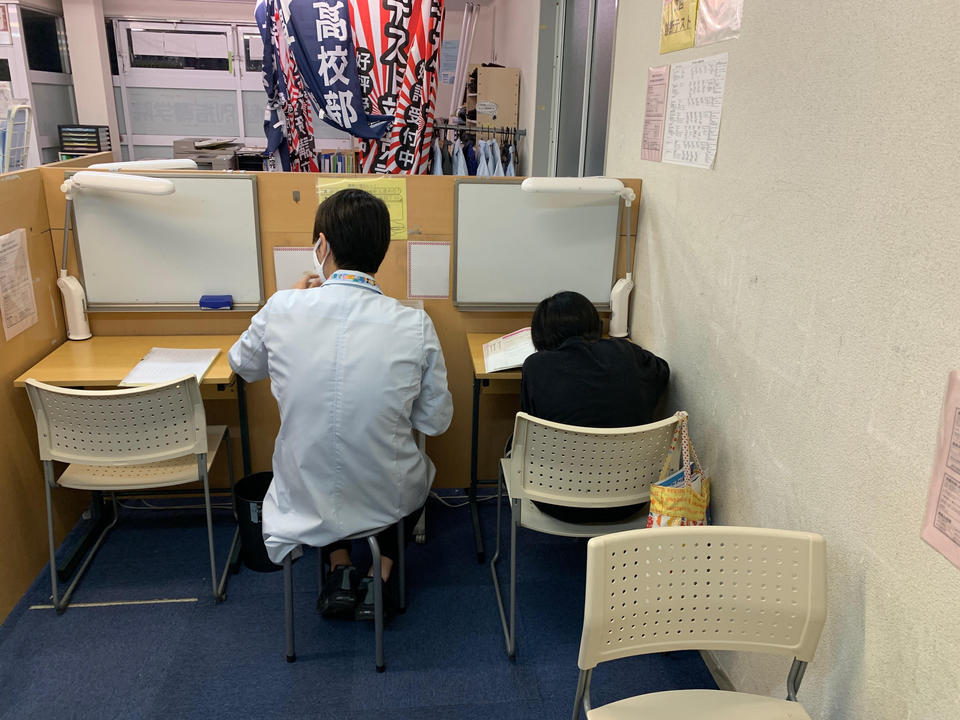 ナビ個別指導学院の授業は、個別の席ごとに設置された自分専用のホワイトボードで解き方や考え方を一緒に確認、それから生徒が問題を解くという「個別授業」スタイルです。