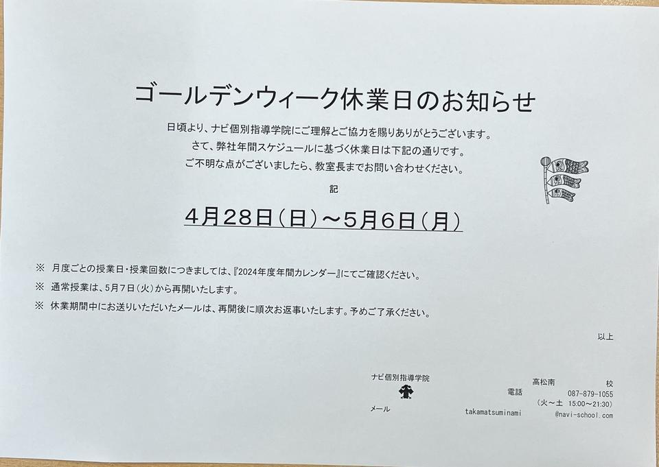 次の授業は5月7日15時~のお渡ししてるカレンダー通りとなります。