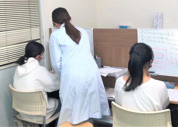 ナビ個別指導学院の授業は、個別の席ごとに設置された自分専用のホワイトボードで解き方や考え方を一緒に確認、それから生徒が問題を解くという「個別授業」スタイルです。