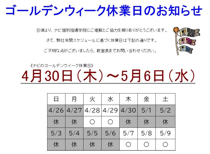 下記の日程がゴールデンウィーク休業期間となります。