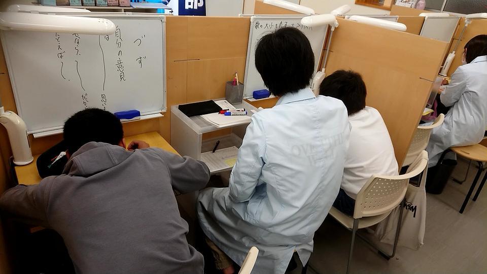 ナビ個別指導学院の授業は、個別の席ごとに設置された自分専用のホワイトボードで解き方や考え方を一緒に確認、それから生徒が問題を解くという「個別授業」スタイルです。