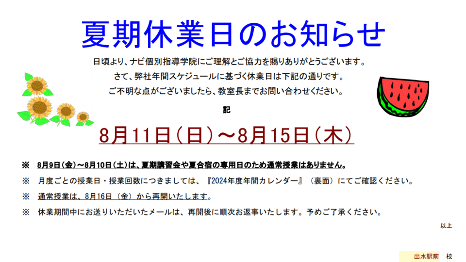 本日はナビ個別指導学院出水駅前校の夏期休業についてお知らせします。