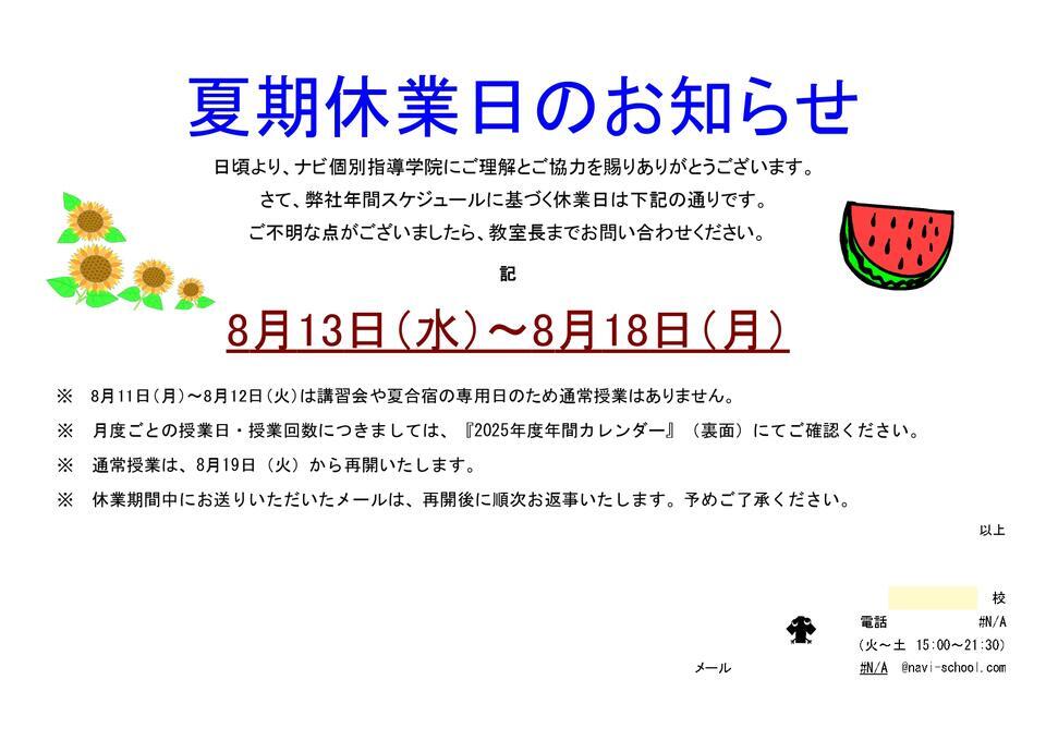 日頃より、ナビ個別指導学院にご理解とご協力を賜りありがとうございます。