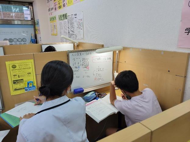 ナビ個別指導学院の授業は、個別の席ごとに設置された自分専用のホワイトボードで解き方や考え方を一緒に確認、それから生徒が問題を解くという「個別授業」スタイルです。