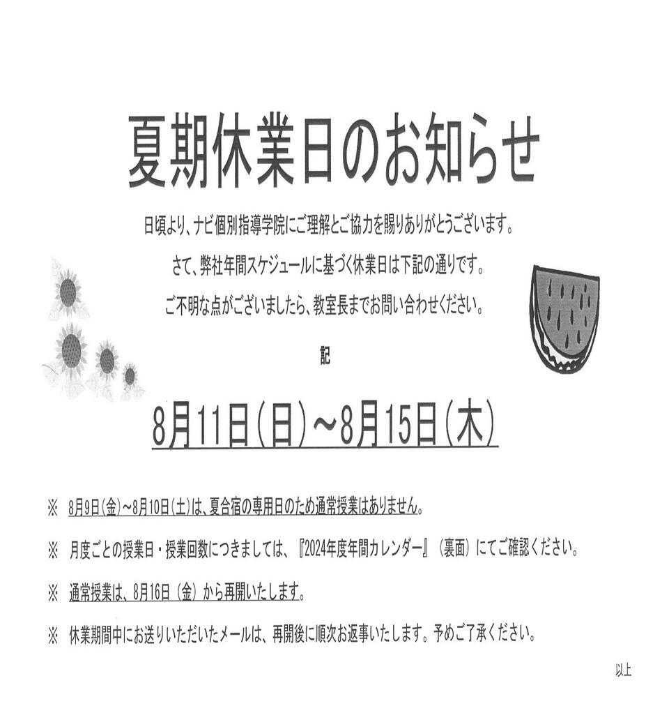 ナビ個別指導学院の年間スケジュールに基づく夏期休業日は、