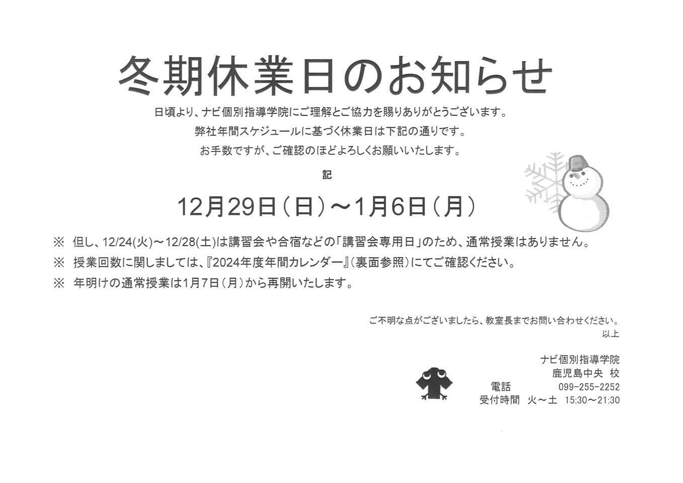※通常授業は12月24日(火)~お休みとなります。
