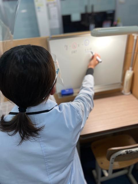 ナビ個別指導学院の授業は、個別の席ごとに設置された自分専用のホワイトボードで解き方や考え方を一緒に確認、それから生徒が問題を解くという「個別授業」スタイルです。