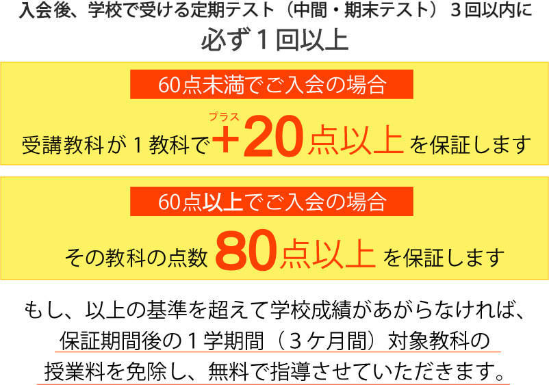 もし、上記の基準を達成できなければ、保証期間後の1学期間(3ヶ月分)対象教科の授業料を免除し(諸経費除く)、無料で指導させていただきます。