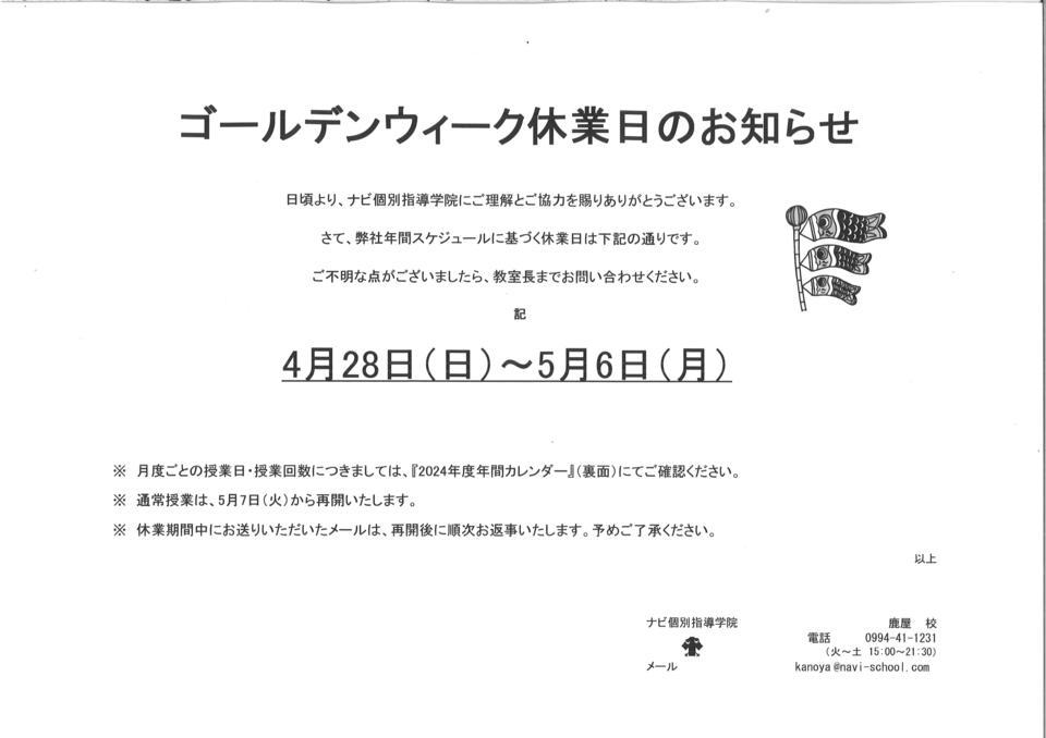 ナビ個別指導学院では以下の日程で通常授業がお休みとなります。