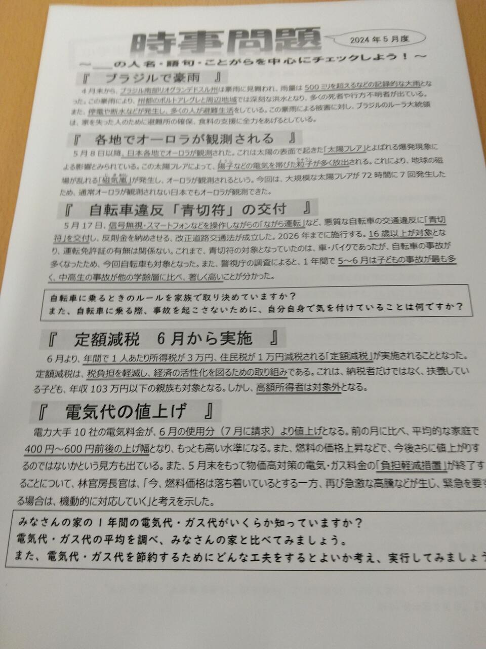 さて!白楽校ではおなじみの「時事問題」の最新版を