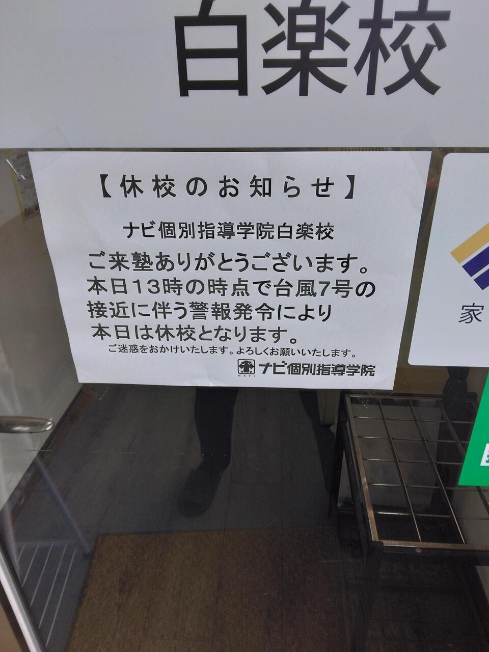 本日のナビの開校についてですが、現在台風による警報が発令中となっております。そちらを踏まえた上で、本日(8/16)一日休校措置を取らせていただき、全ての授業をお振替という形で対応させていただきます。振替日程につきましては、明日以降ご相談をさせていただけたらと思います。