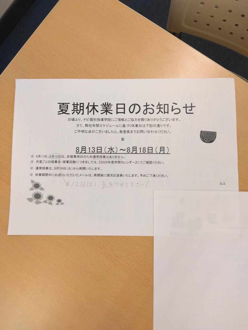 本日は夏期休業日のお知らせがございます。