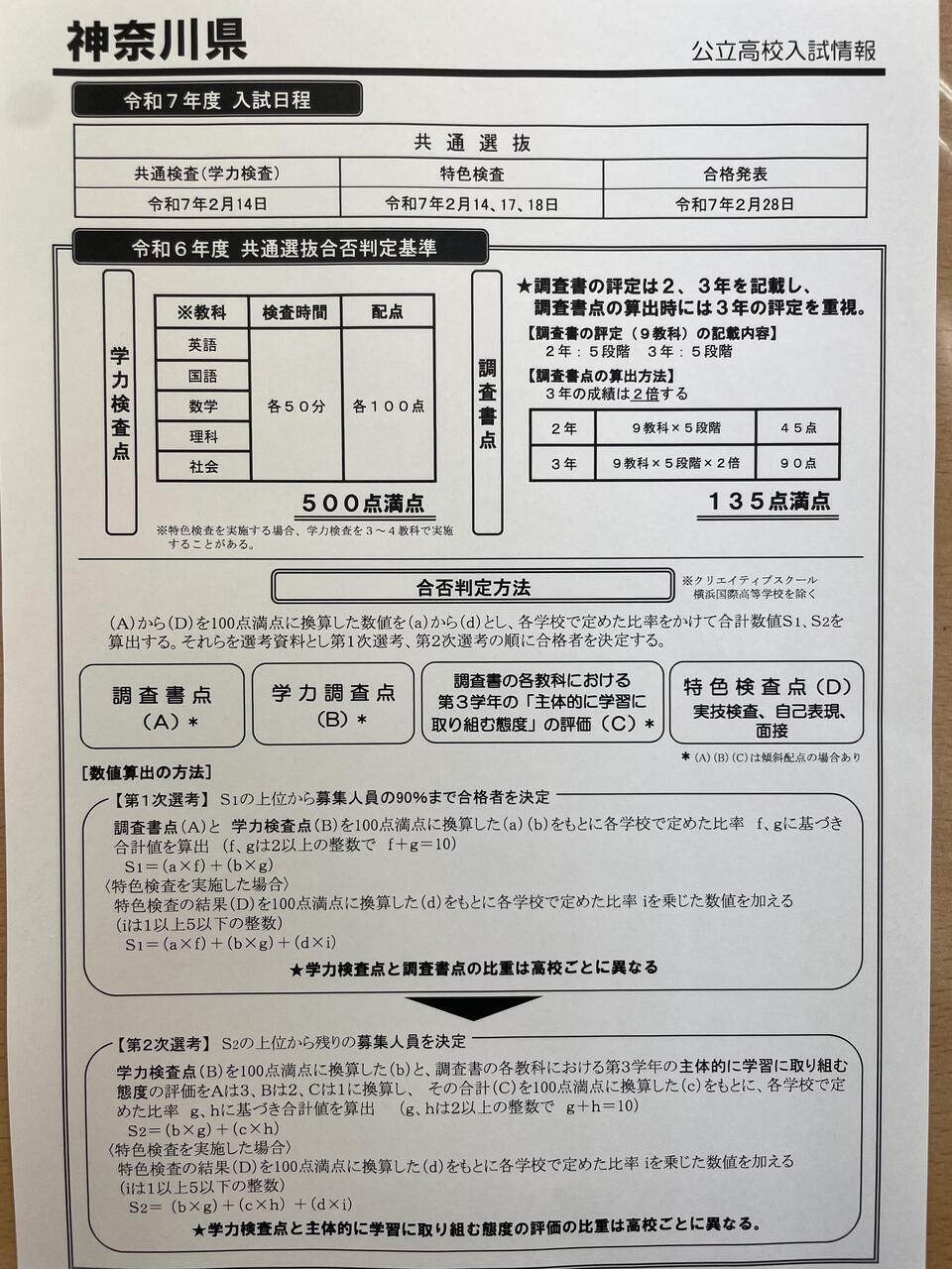 神奈川県の高校入試では当日の入試の点数の他に通知表の数値が合否に関わります。