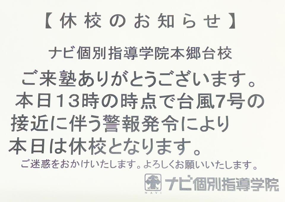 本日のナビ個別の開校についてですが、現在台風による警報が発令中となっております。そちらを踏まえた上で、本日一日休校措置を取らせていただき、全ての授業をお振替という形で対応させていただきます。お手数おかけいたしますが、何卒よろしくお願いいたします。