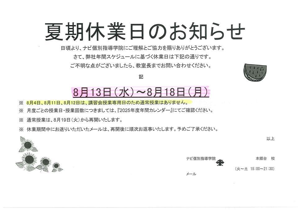 日頃より、ナビ個別指導学院にご理解とご協力を賜りありがとうございます。