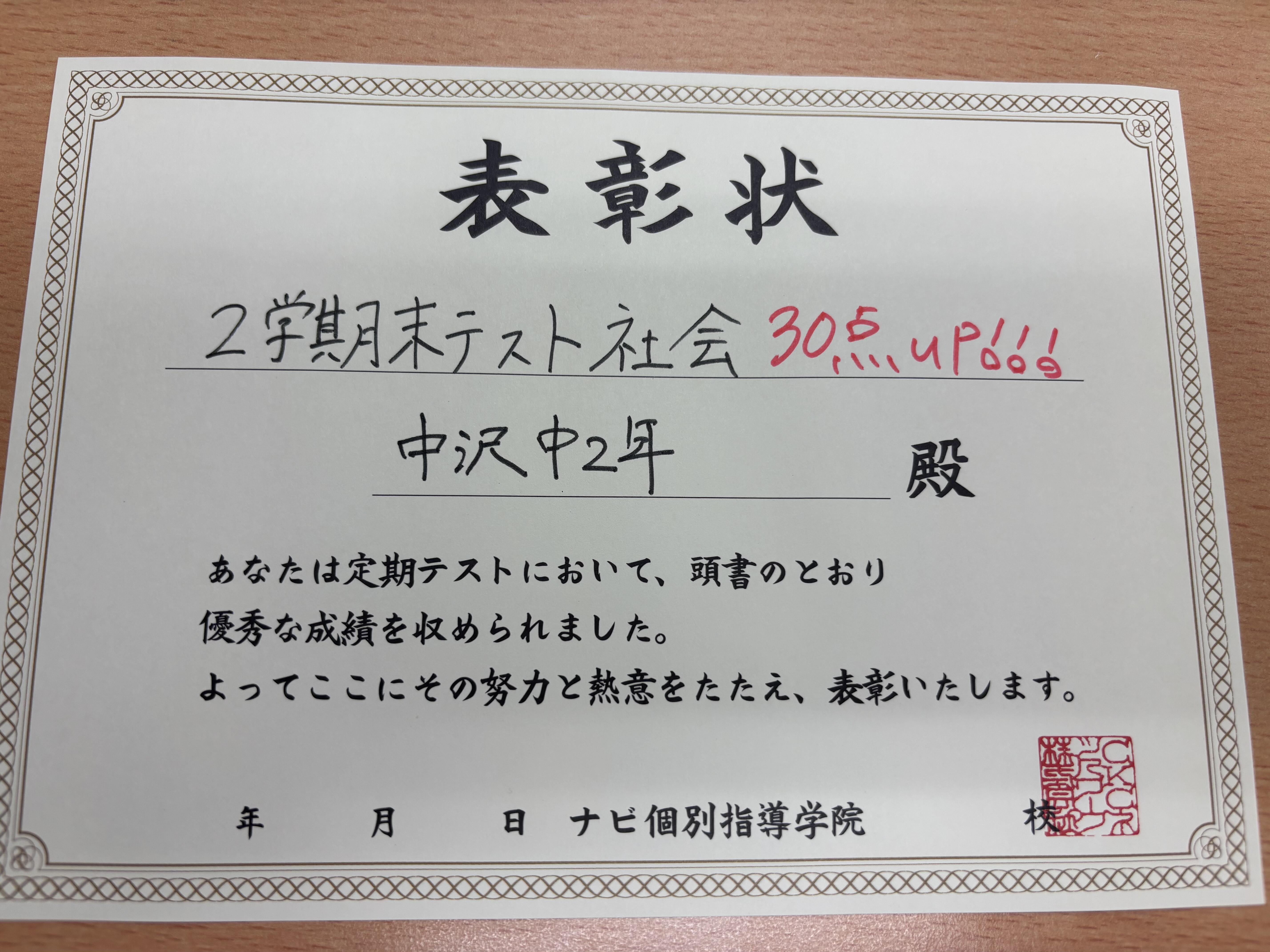 2学期期末テストの成績アップのご紹介第4弾は中沢中の2年生で社会がなんと30点アップ!!