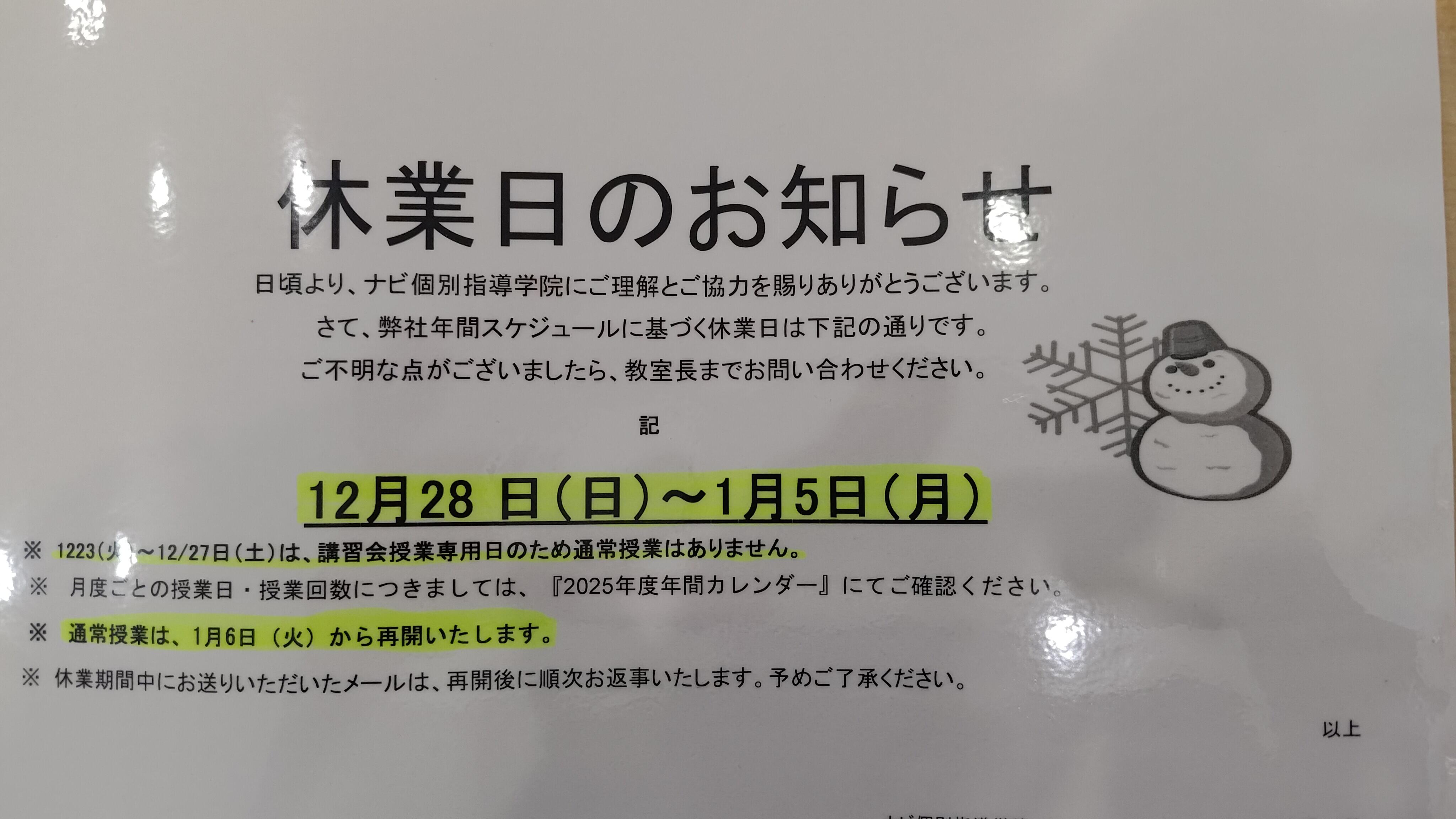 長期の休業となりますが体調に気をつけて復習に力を入れていきましょう!