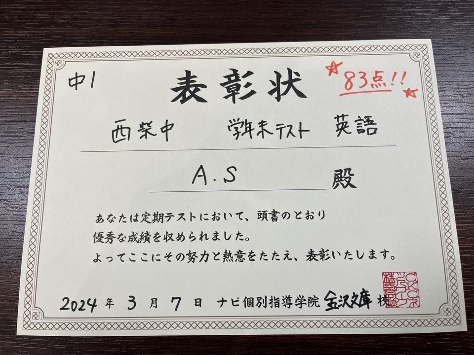 ②西柴中1年 Aくん 英語83点