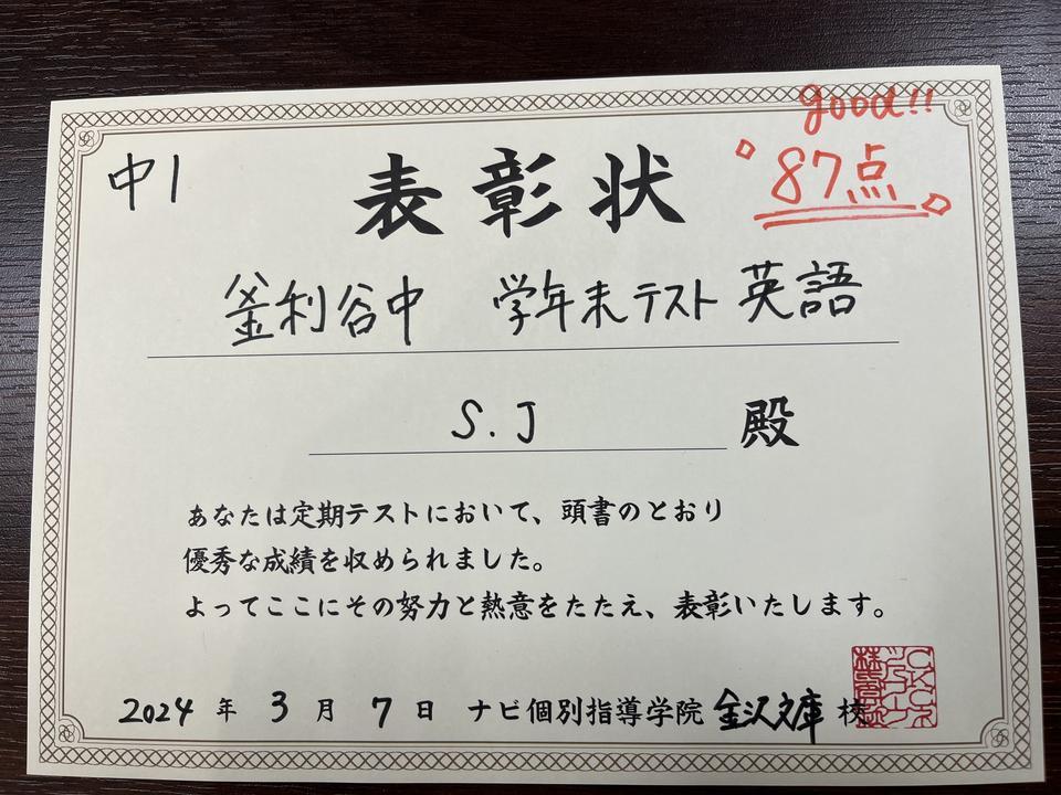 ①釜利谷中1年 Sさん 英語87点