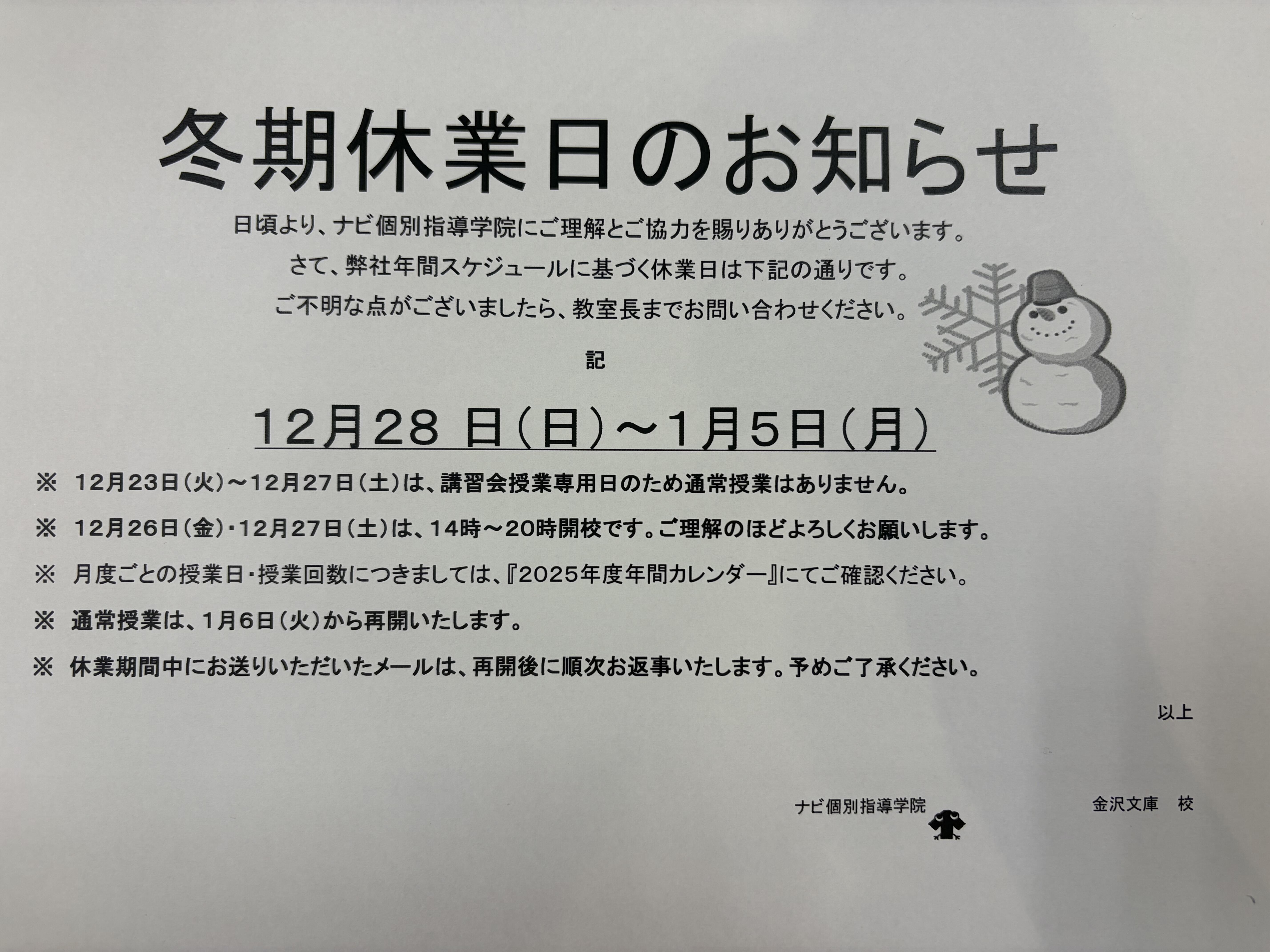 12月28日(日)~1月5日(月)は冬期休業のため、お休みとなります。