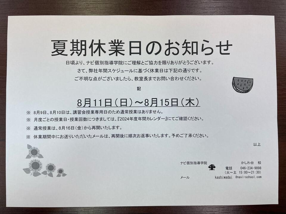 8/11~8/15は夏期休業日で、通常授業、講習授業共にお休みになっております。