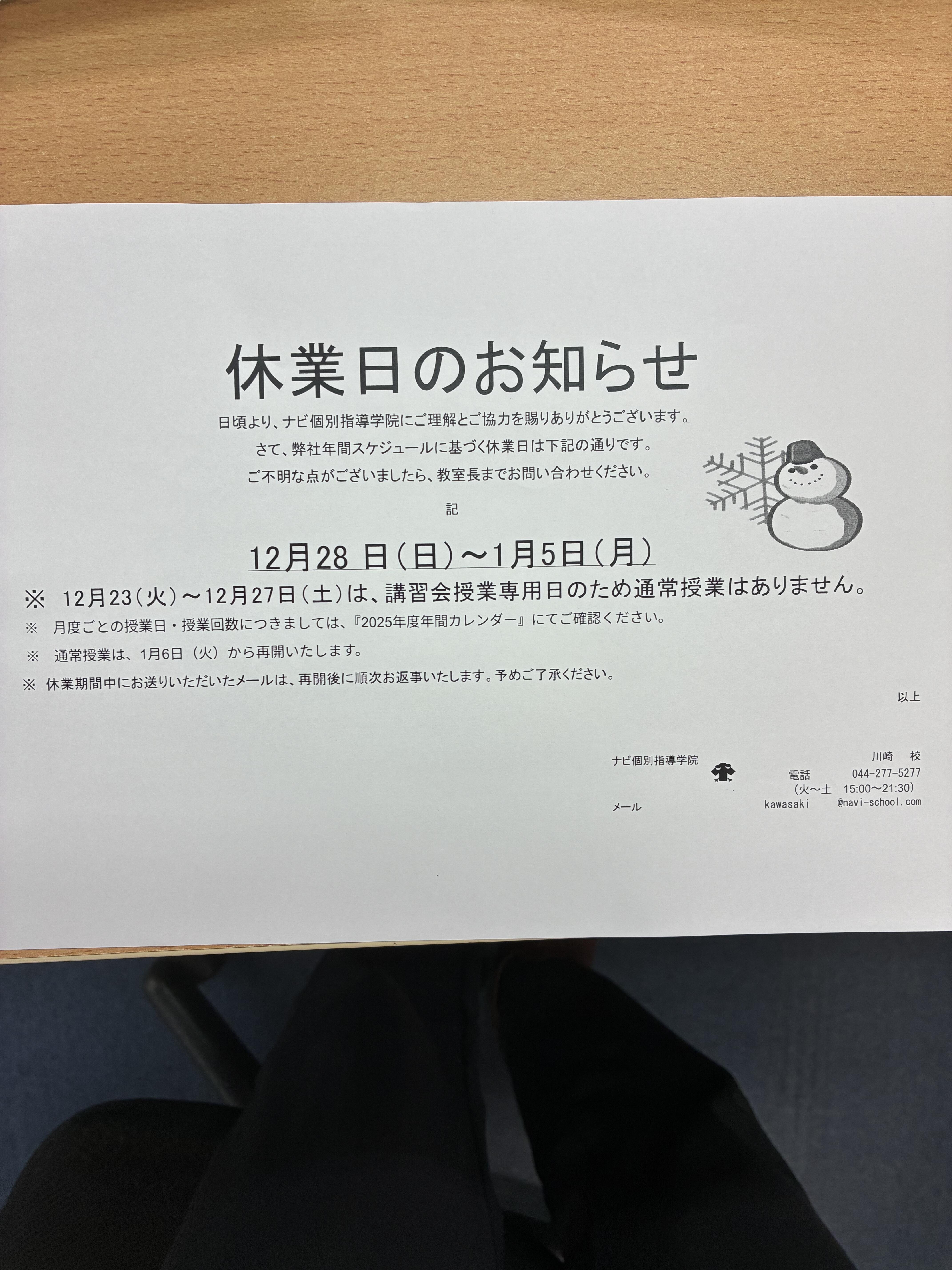 日頃より、ご理解とご協力を賜りありがとうございます!冬期休業についてのお知らせです。ナビ個別指導学院の年間スケジュールに基づく冬期休業日は下記の通りです。 12月28日(日)~1月5日(月)