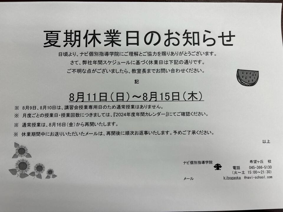 この間は授業をはじめ、夏期講習、自習、その他問い合わせのすべてがご利用になれません。