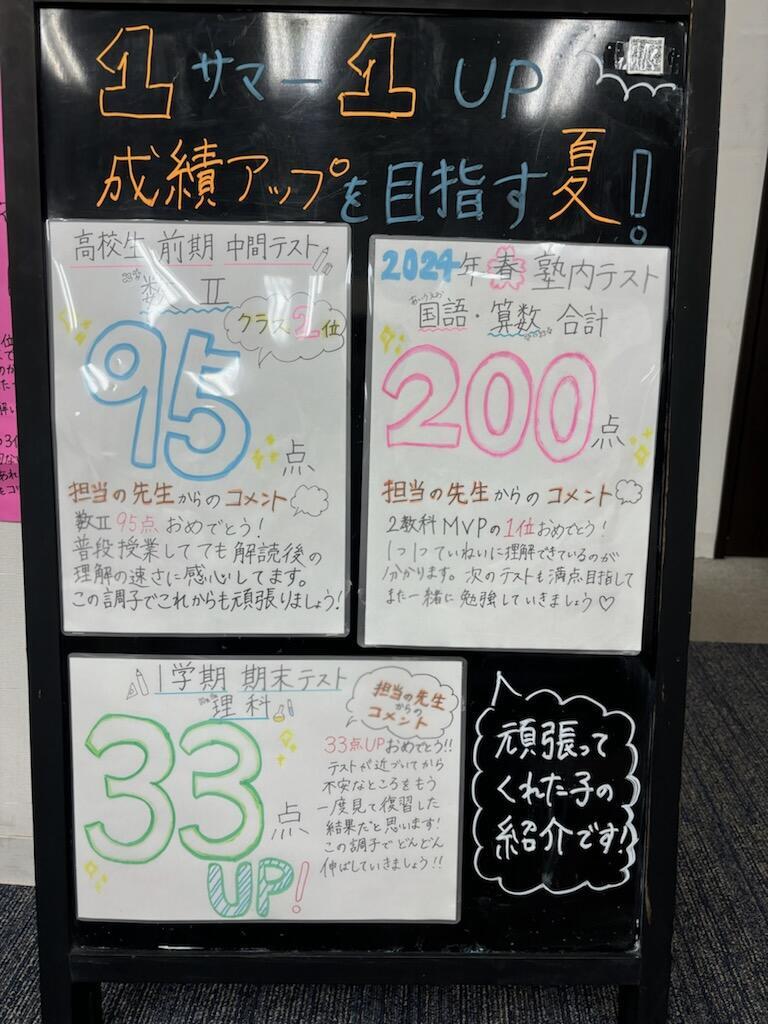 塾の外に塾生の頑張りである成績アップの掲示を始めました。