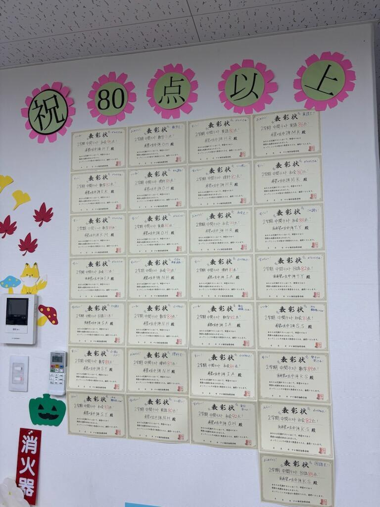 9月の定期テストにて、80点以上の高得点を取ってくれた生徒たちの表彰状を掲示しました。