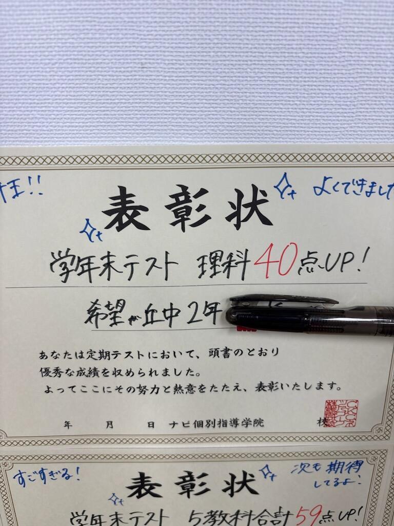 まずは希望が丘中の2年生で、理科がなんと・・・40点アップ!!!