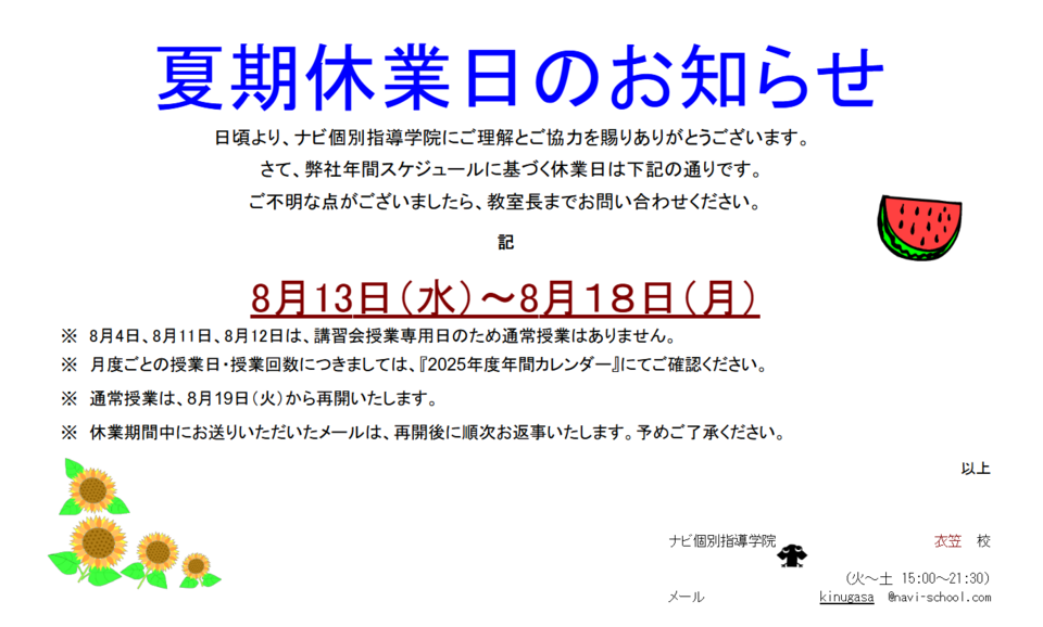 8/13(水)~8/18(月)までは夏期休業となっております。