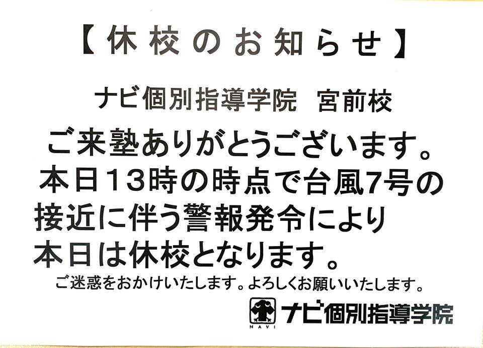 お世話になっております。ナビ個別指導学院 宮前校です。本日のナビの開校についてですが、現在台風による警報が発令中となっております。そちらを踏まえた上で、本日一日休校措置を取らせていただき、全ての授業をお振替という形で対応させていただきます。振替日程につきましては、明日以降eナビにてご相談をさせていただけたらと思います。お手数おかけいたしますが、何卒よろしくお願いいたします。