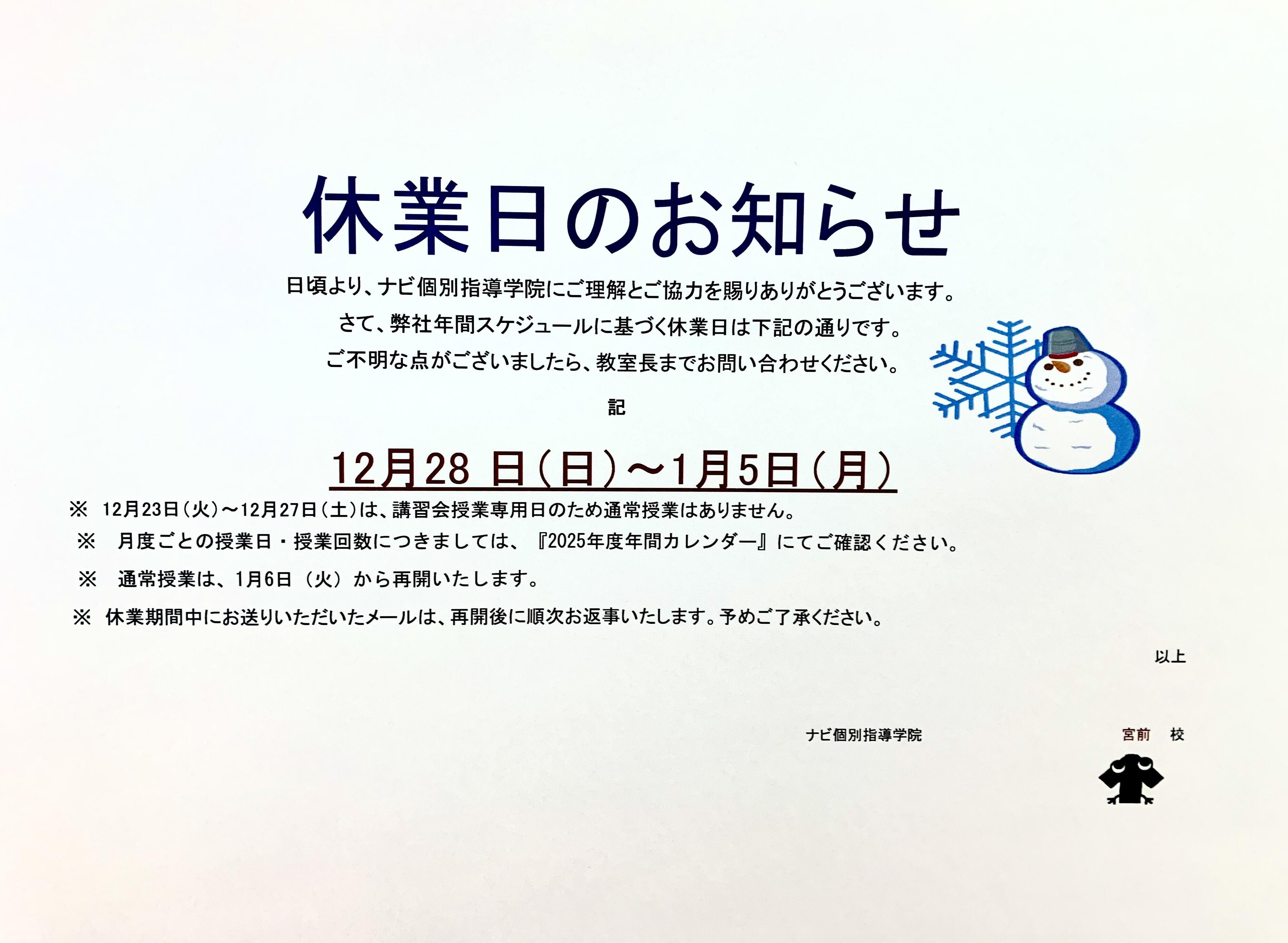 12月28日(日)~1月5日(月)は