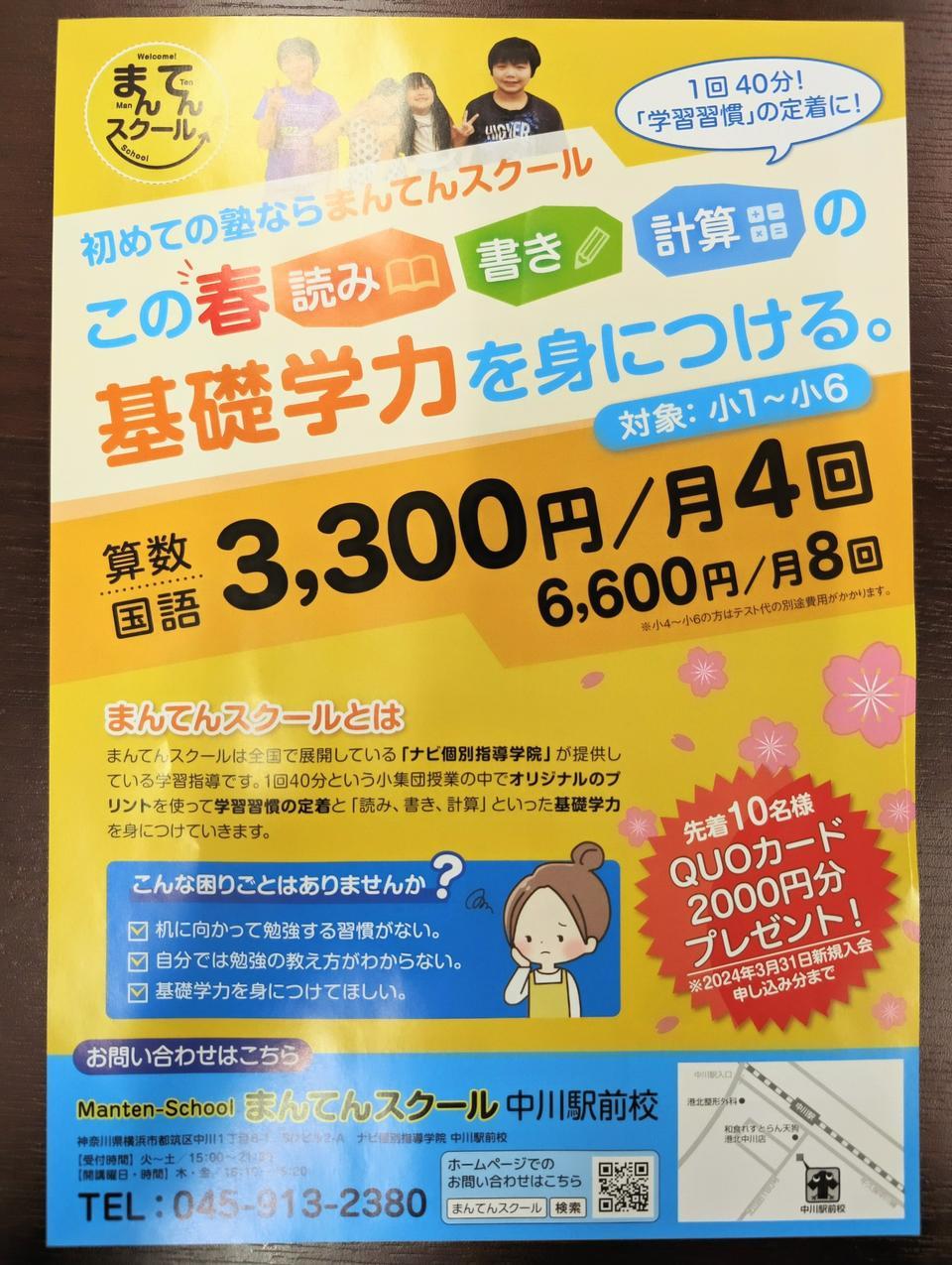 私営地下鉄ブルーライン中川駅前徒歩1分、ナビ個別指導学院中川駅前校です。