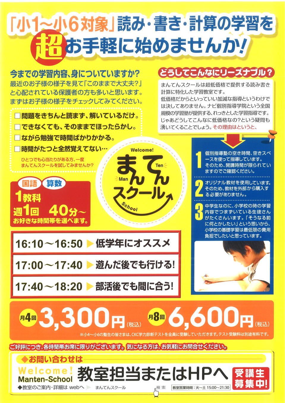 ナビ個別指導学院併設のプリント学習教室【まんてんスクール】のご案内です。