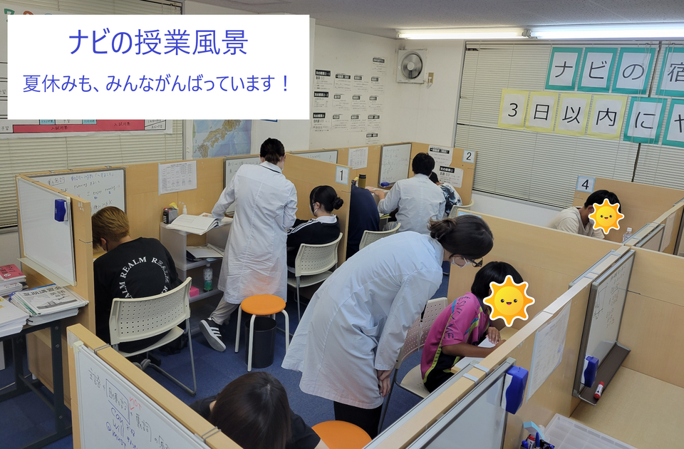 ナビ個別二宮校では現在、9月以降のテスト範囲の予習を中心とした授業と、夏期講習による復習授業で"アツい夏"の真っ盛りです!
