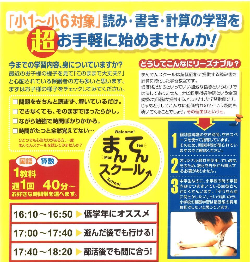 計算力や漢字を鍛えるために、ナビ個別の通常授業と併用することも可能です。