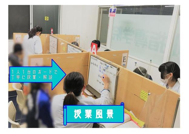 ナビ個別指導学院の授業は、個別の席ごとに設置された自分専用のホワイトボードで解き方や考え方を一緒に確認、それから生徒が問題を解くという「個別授業」スタイルです。