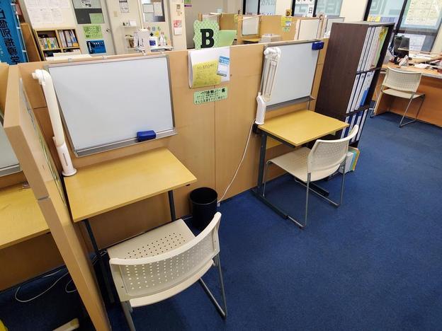 ナビ個別指導学院の授業は、個別の席ごとに設置された自分専用のホワイトボードで解き方や考え方を一緒に確認、それから生徒が問題を解くという「個別授業」スタイルです。