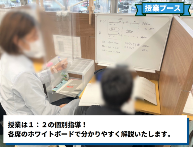 ナビ個別指導学院の授業は、個別の席ごとに設置された自分専用のホワイトボードで解き方や考え方を一緒に確認、それから生徒が問題を解くという「個別授業」スタイルです。