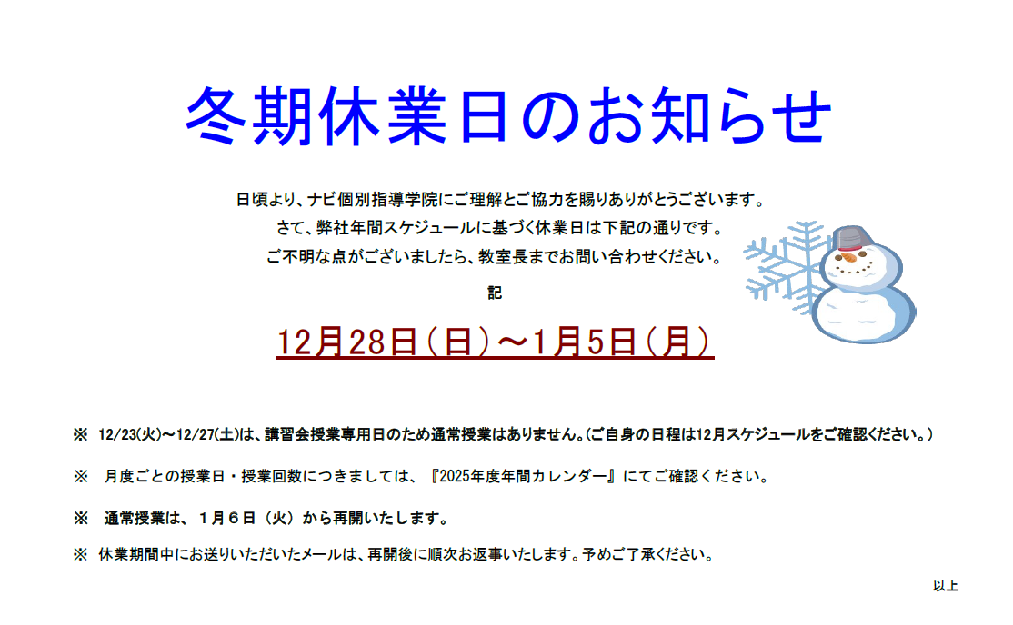 日頃より、ナビ個別指導学院にご理解とご協力を