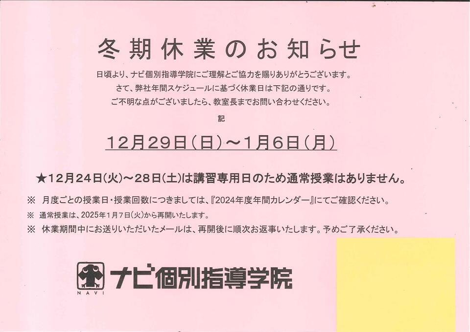 ※12/24~12/28は講習会専用日の為、通常授業はございません。