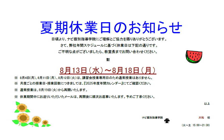日頃より、ナビ個別指導学院にご理解とご協力を賜りありがとうございます。