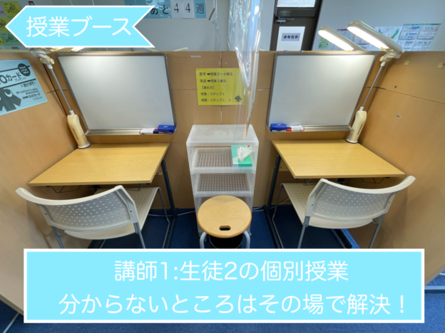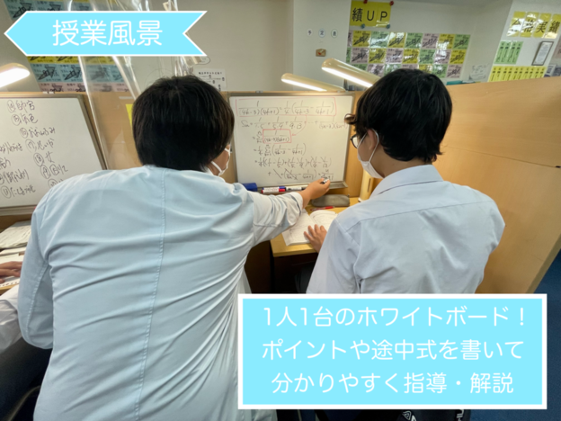 ナビ個別指導学院の授業は、個別の席ごとに設置された自分専用のホワイトボードで解き方や考え方を一緒に確認、それから生徒が問題を解くという「個別授業」スタイルです。