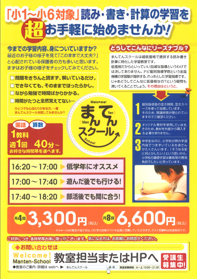 ナビ個別指導学院では、小学生対象の「まんてんスクール」